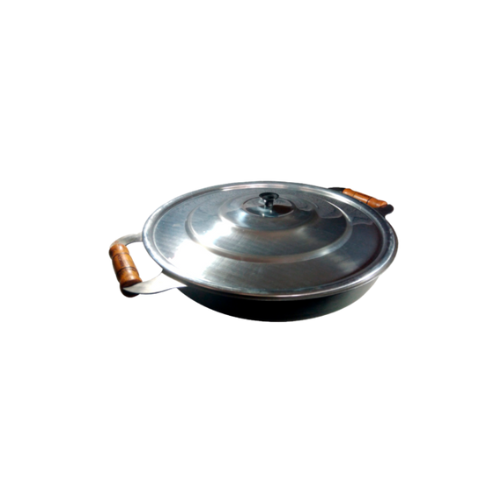 PAEJEIRA 40 (DISCO): aço carbono com pintura preta na parte externa DIMENSÃO: Diametro 40 cm – Altura 6,5 cm CABO: madeira TAMPA: aluminio
